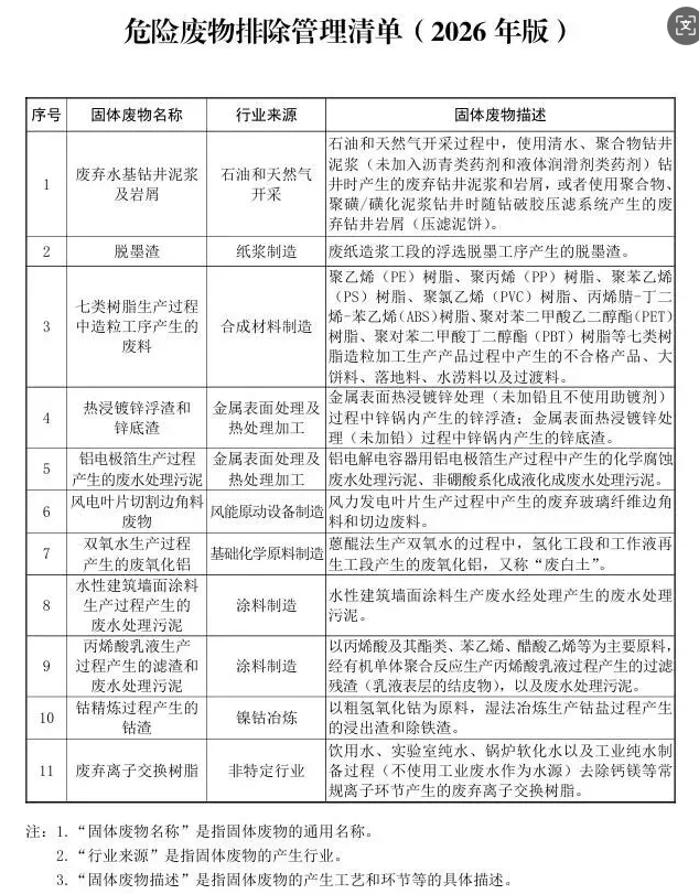 关于发布《危险废物排除管理清单(2026年版)》的公告